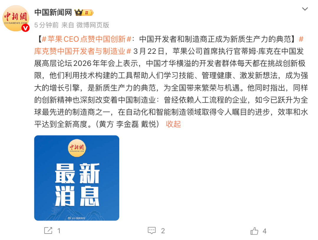 3月22日,苹果公司首席执行官蒂姆·库克在中国发展高层论坛2026年年会上表示,中国才华横溢的开发者群体每天都在挑战创新极限,他们利用技术构建的工具帮助人们学习技能、管理健康、激发新想法,成为强大的增长引擎,是新质生产力的典范,为全国带来繁荣与机遇。