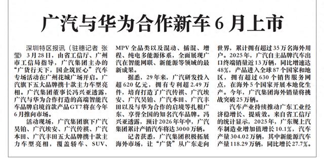 记者获悉,广汽集团积极拓展海外市场,让“广货”从广东走向世界,累计拥有超过35万名海外用户。2025年,广汽自主品牌汽车出口终端销量近13万辆,同比增速达48%,产品进入全球87个国家和地区,拥有超过630个销售服务网点,在海外5个国家开展本地化生产。今年,广汽集团海外销量将挑战突破25万辆。